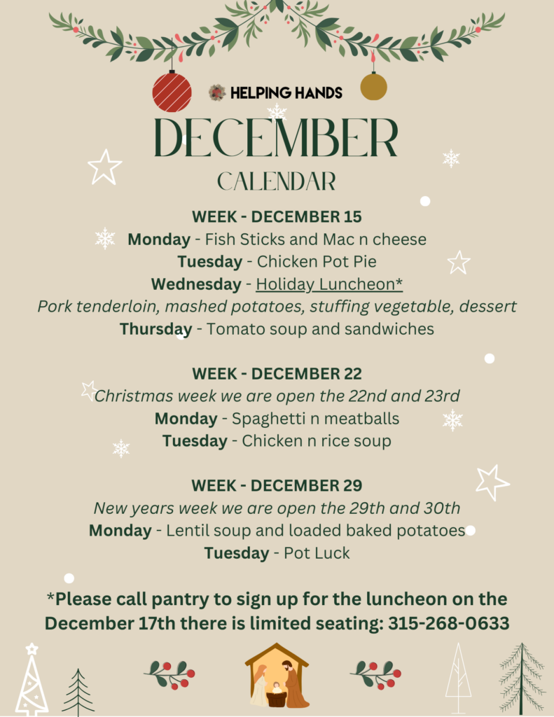 Helping Hands of Potsdam, Inc. is a faith-based non-profit organization serving Potsdam, New York and the outlying area. It was founded in 2004 and is entirely supported by the kindness and generosity of local churches, individuals, organizations, and businesses.
